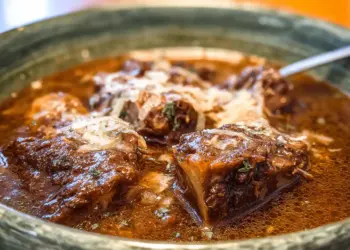 French onion beef short rib soup made with caramelized onions and slow-cooked beef for deep, rich…