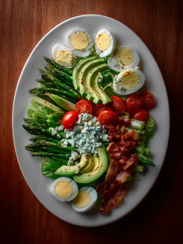 Serve this spring Cobb salad on a chilled platter for brunch, where the sunny rows of radish pink and asparagus green steal the show alongside fluffy biscuits and fresh scones—it’s the centerpiece that feels fancy without fuss. Pair with crusty baguette slices to sop up extra vinaigrette, evoking lazy spring afternoons.